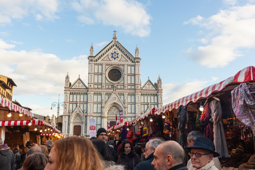 Florence Italy – December 7 2014: Tourists visits the christmas market in Santa Croce Square. Xmas time in county town of Tuscany.